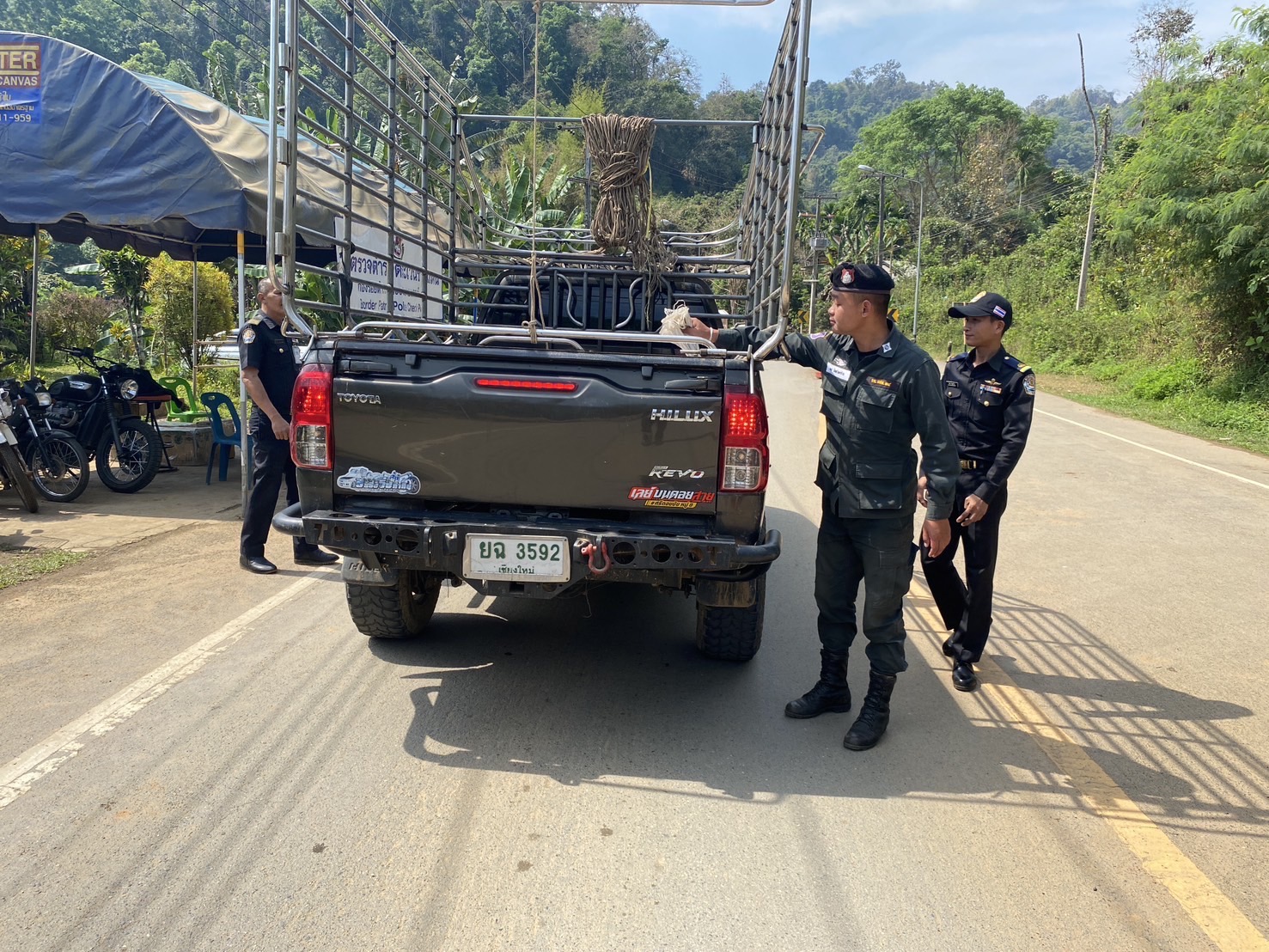 เมื่อ 110800-120759 มี.ค.68 ชฝต.บ้านแม่อมกิจัด กพ 3 นาย ร่วมกับ เจ้าหน้าที่สารวัตรปศุสัตว์ จ.ขอนแก่น ทำการตั้งจุดตรวจ-จุดสกัด บนทางหลวงหมายเลข 105 (แม่สอด-แม่สะเรียง) บริเวณหน้าจุดตรวจบ้านแม่อมกิ ม.4 ต.แม่วะหลวง อ.ท่าสองยาง จ.ตาก เพื่อป้องกันปราบปรามอาชญากรรมสำคัญ การลักลอบลำเลียงยาเสพติด สารตั้งต้นและเคมีภัณฑ์,การปราบปรามคนร้ายข้ามชาติและเข้าเมืองโดยผิดกฎหมาย ป้องกันและควบคุมการลักลอบเคลื่อนย้ายสัตว์และซากสัตว์ ประชาสัมพันธ์ให้ประชาชนได้รับทราบ
