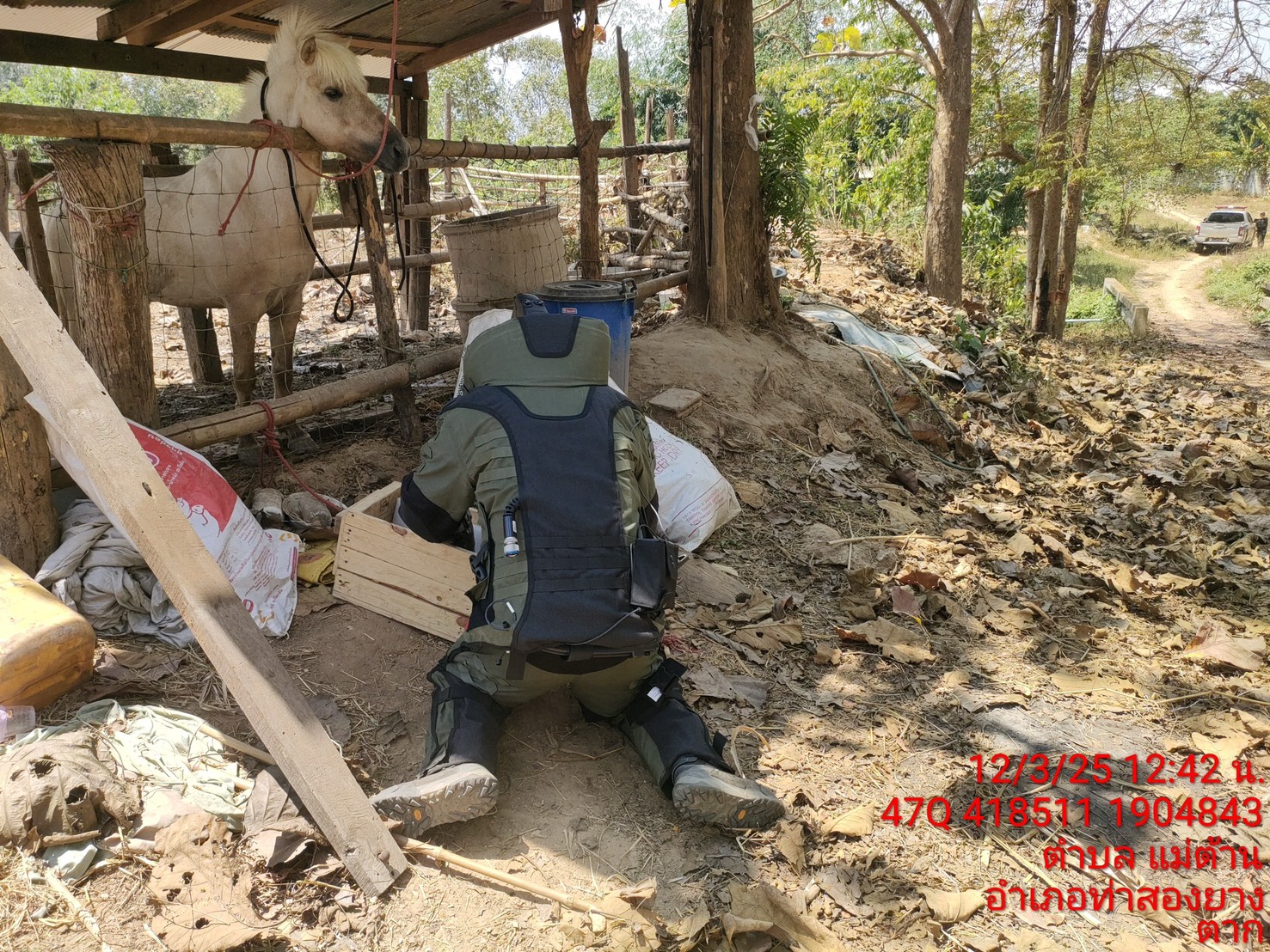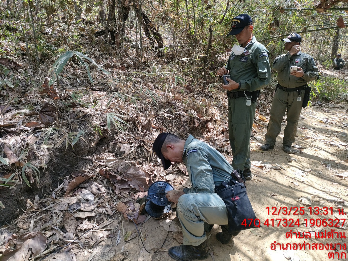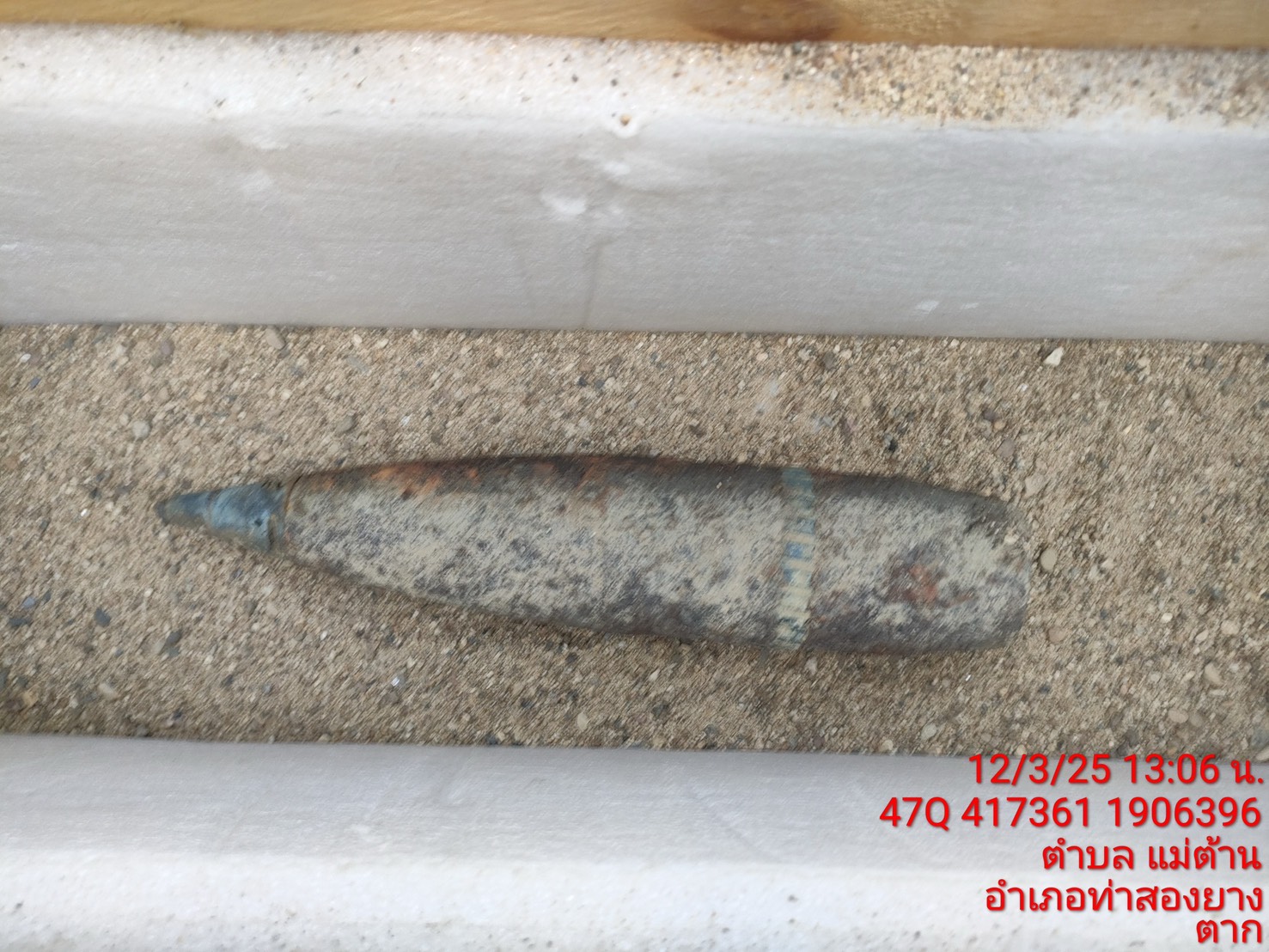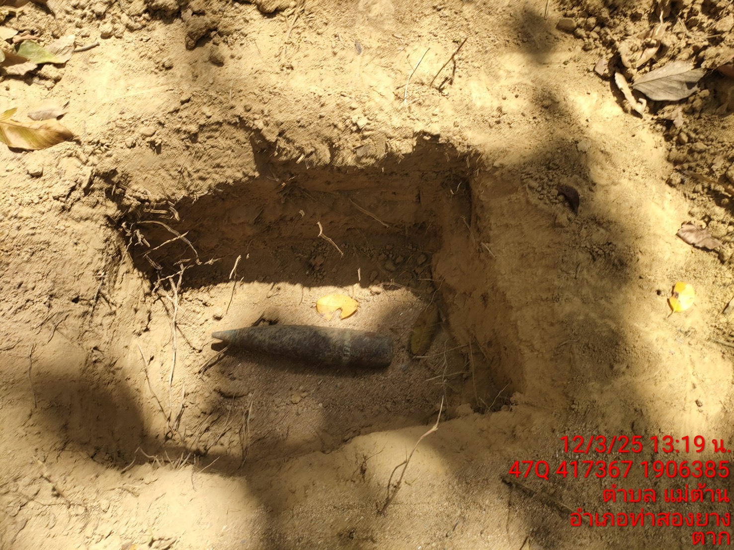 เมื่อ 12 มี.ค.68 เวลา 12.00 น. ร.ต.อ.ธวัช  ปั้นเหน่ง  รอง ผบ.ร้อย ตชด.344 พร้อมกำลังพลรวม 6 นาย ,จนท.ตร.สภ.ท่าสองยางร่วมอำนวยความสะดวกให้กับ จนท.ชุดเก็บกู้ทำลายวัตถุระเบิด(EOD) กก.ตชด.34 นำโดย ร.ต.อ.วิชัย  สุนทรไชย หน.ชุดฯ พร้อมกำลังพล รวม 6 นาย เดินทางโดย รยบ.ทะเบียนตราโล่หมายเลข 57603 เข้าตรวจสอบพิสูจน์ทราบวัตถุระเบิด ที่ถูกพบในพื้นที่ ม.2 ต.แม่ต้าน อ.ท่าสองยาง จ.ตาก  จากการตรวจสอบ พบว่าเป็นกระสุนเครื่องยิงลูกระเบิดไร้แรงสะท้อนถอยหลัง ก.ปรส.ขนาด 75 มม. ชนิดระเบิด(HE) จำนวน 1 ลูก โดยลูกระเบิดดังกล่าวมีสภาพเก่าและเป็นสนิม จากนั้นชุดเก็บกู้ทำลายวัตถุระเบิดจึงได้ทำการเก็บกู้เคลื่อนย้ายไปทำลายในเขตพื้นที่ปลอดภัย บริเวณสวนป่าหลังกองร้อย ตชด.344 บ้านใหม่ ม.1 ต.แม่ต้าน อ.ท่าสองยาง จ.ตาก การทำลายวัตถุระเบิดเสร็จสิ้น เวลา 17.00 น. เหตุการณ์ปกติ ไม่มีทรัพสินของทางราชการเสียหาย และไม่มีผู้ได้รับบาดเจ็บแต่อย่างใด
