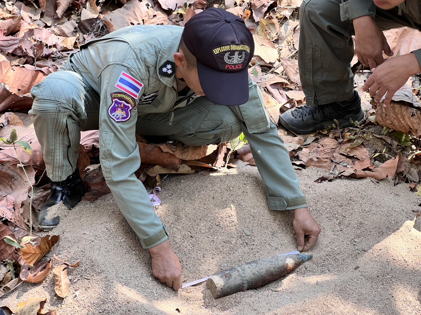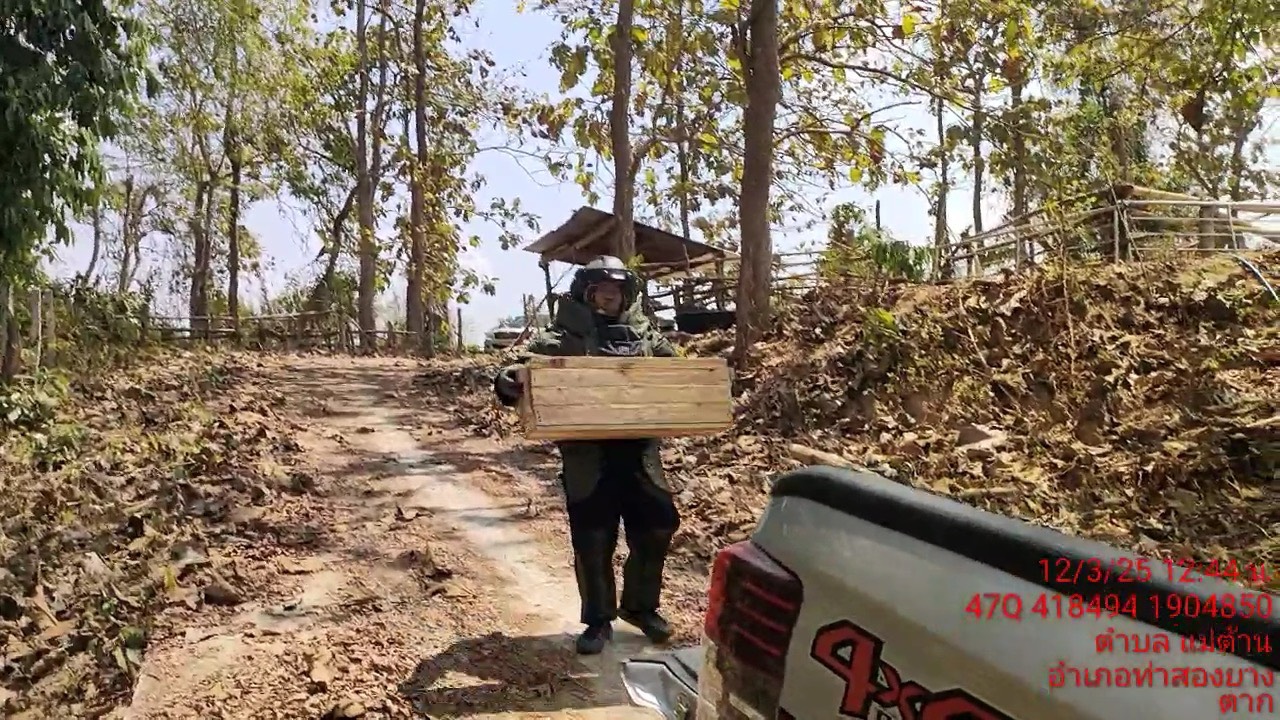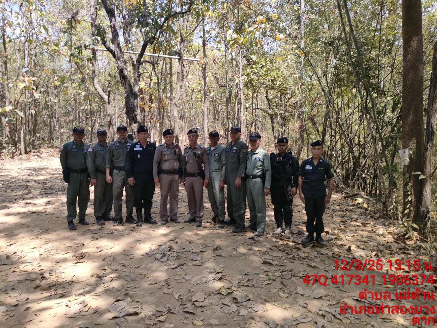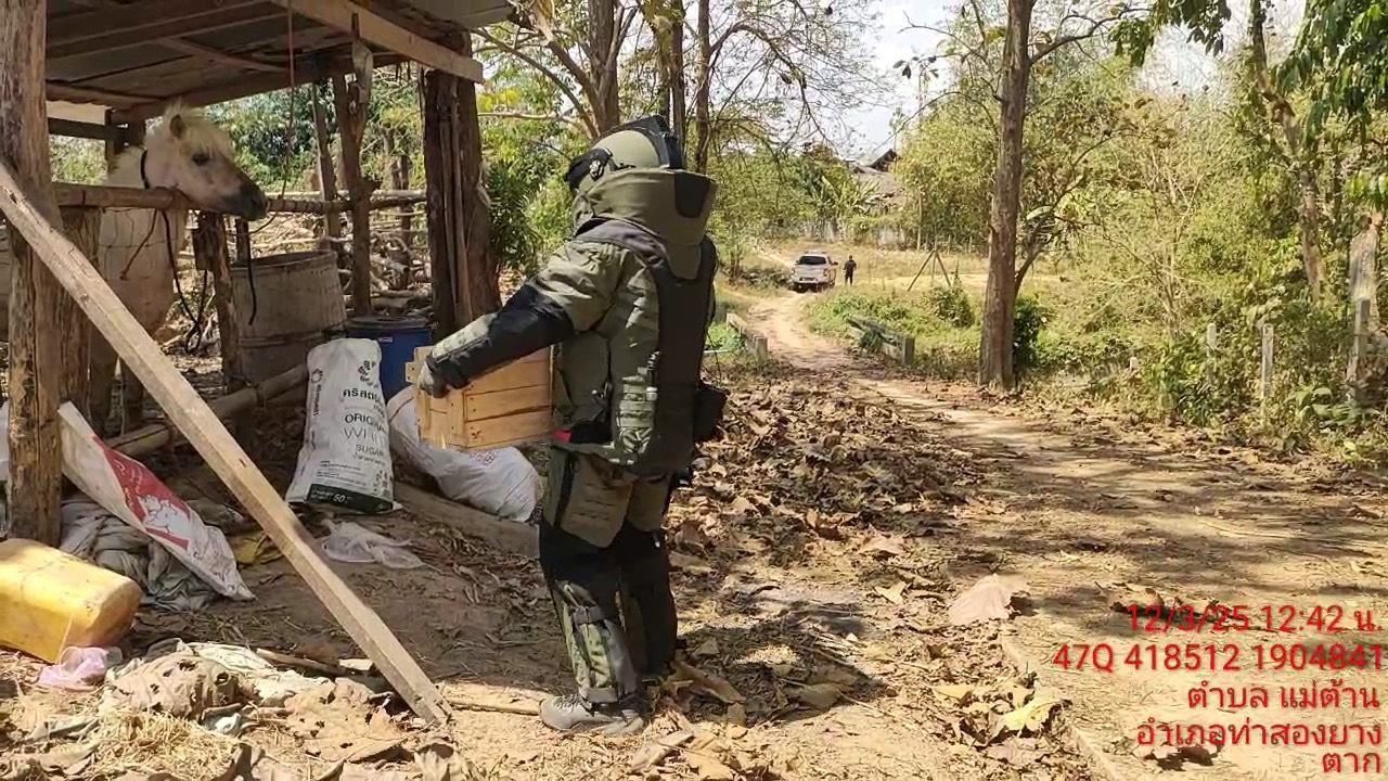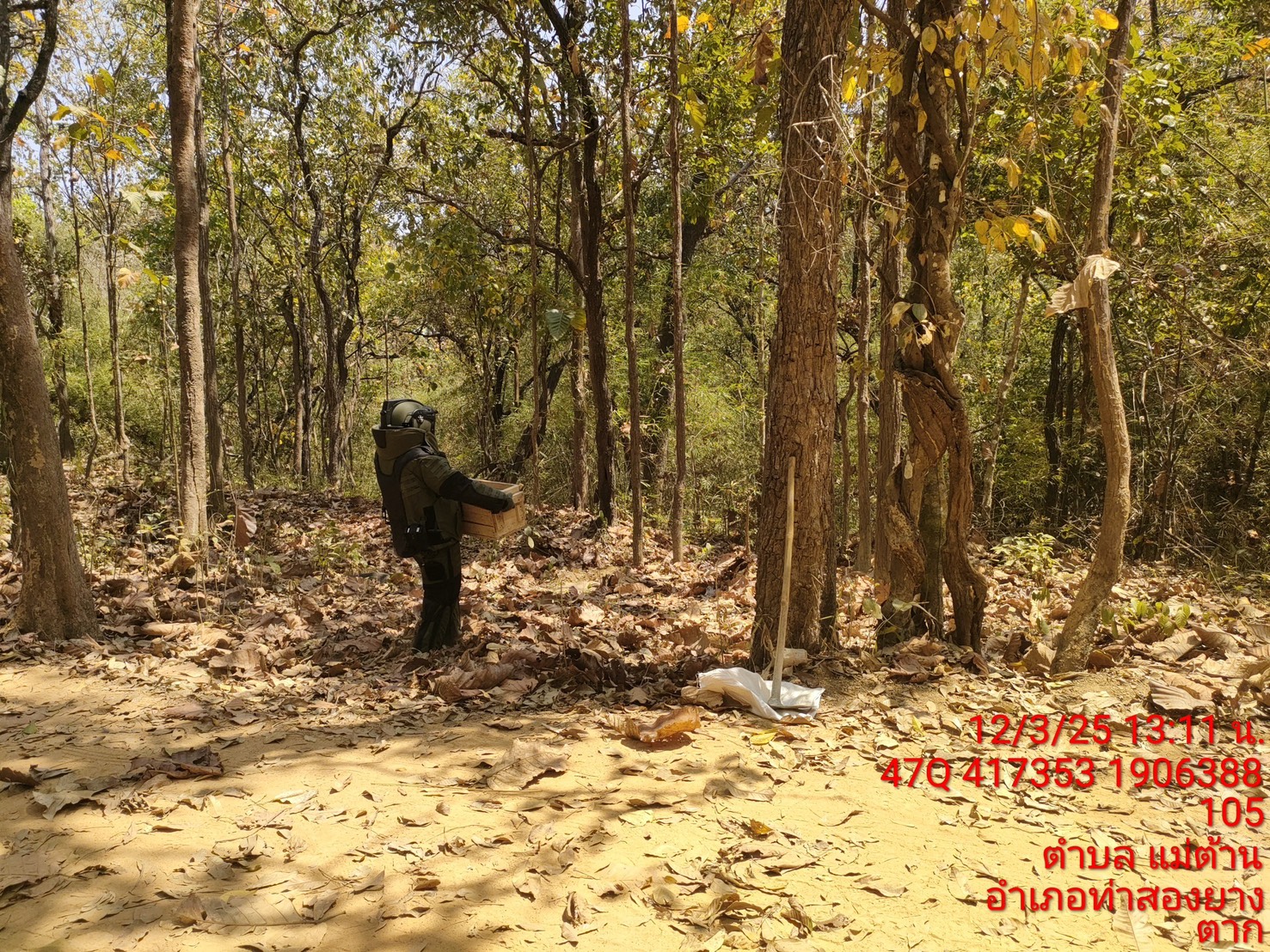 เมื่อ 12 มี.ค.68 เวลา 12.00 น. ร.ต.อ.ธวัช  ปั้นเหน่ง  รอง ผบ.ร้อย ตชด.344 พร้อมกำลังพลรวม 6 นาย ,จนท.ตร.สภ.ท่าสองยางร่วมอำนวยความสะดวกให้กับ จนท.ชุดเก็บกู้ทำลายวัตถุระเบิด(EOD) กก.ตชด.34 นำโดย ร.ต.อ.วิชัย  สุนทรไชย หน.ชุดฯ พร้อมกำลังพล รวม 6 นาย เดินทางโดย รยบ.ทะเบียนตราโล่หมายเลข 57603 เข้าตรวจสอบพิสูจน์ทราบวัตถุระเบิด ที่ถูกพบในพื้นที่ ม.2 ต.แม่ต้าน อ.ท่าสองยาง จ.ตาก  จากการตรวจสอบ พบว่าเป็นกระสุนเครื่องยิงลูกระเบิดไร้แรงสะท้อนถอยหลัง ก.ปรส.ขนาด 75 มม. ชนิดระเบิด(HE) จำนวน 1 ลูก โดยลูกระเบิดดังกล่าวมีสภาพเก่าและเป็นสนิม จากนั้นชุดเก็บกู้ทำลายวัตถุระเบิดจึงได้ทำการเก็บกู้เคลื่อนย้ายไปทำลายในเขตพื้นที่ปลอดภัย บริเวณสวนป่าหลังกองร้อย ตชด.344 บ้านใหม่ ม.1 ต.แม่ต้าน อ.ท่าสองยาง จ.ตาก การทำลายวัตถุระเบิดเสร็จสิ้น เวลา 17.00 น. เหตุการณ์ปกติ ไม่มีทรัพสินของทางราชการเสียหาย และไม่มีผู้ได้รับบาดเจ็บแต่อย่างใด