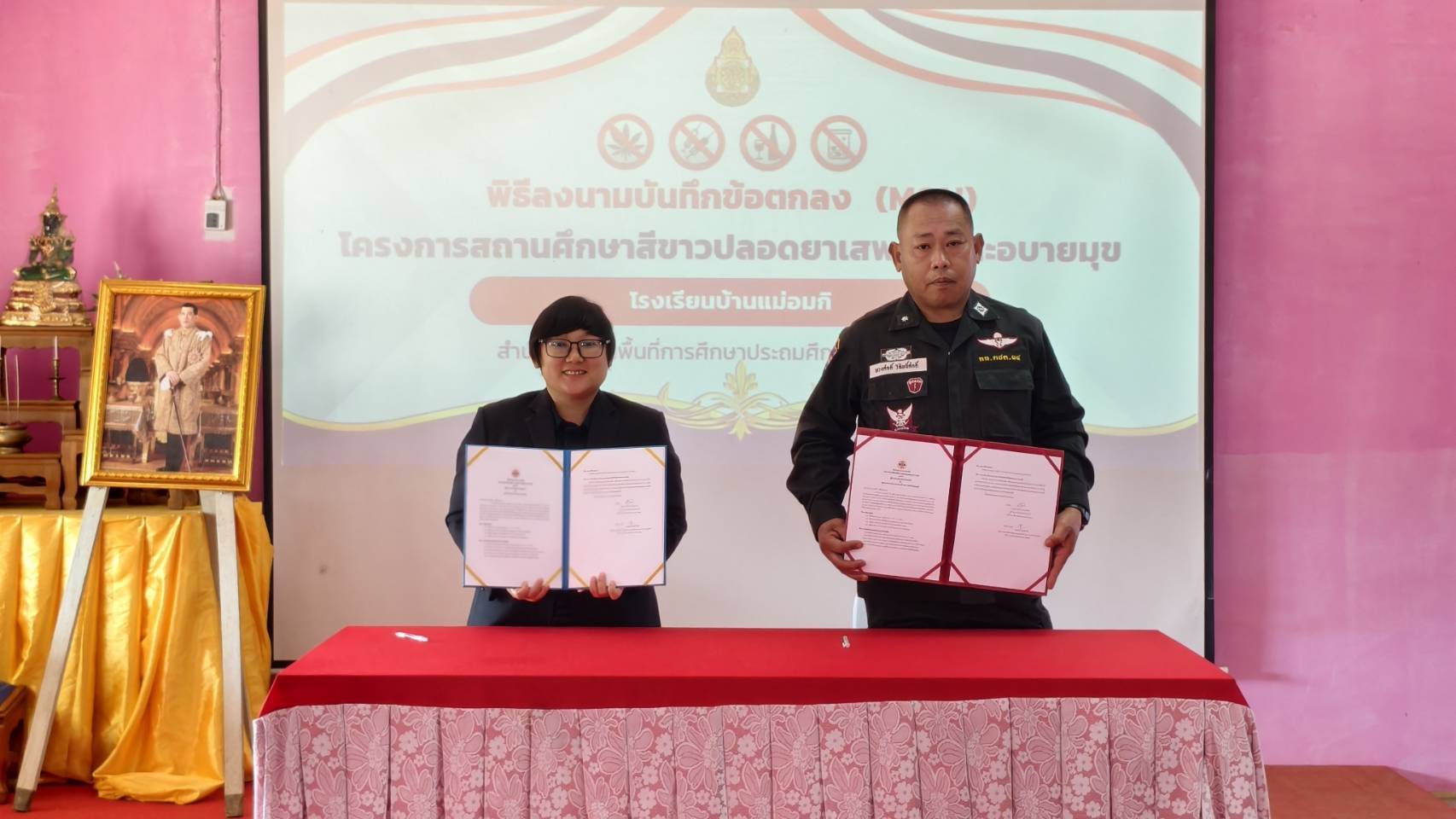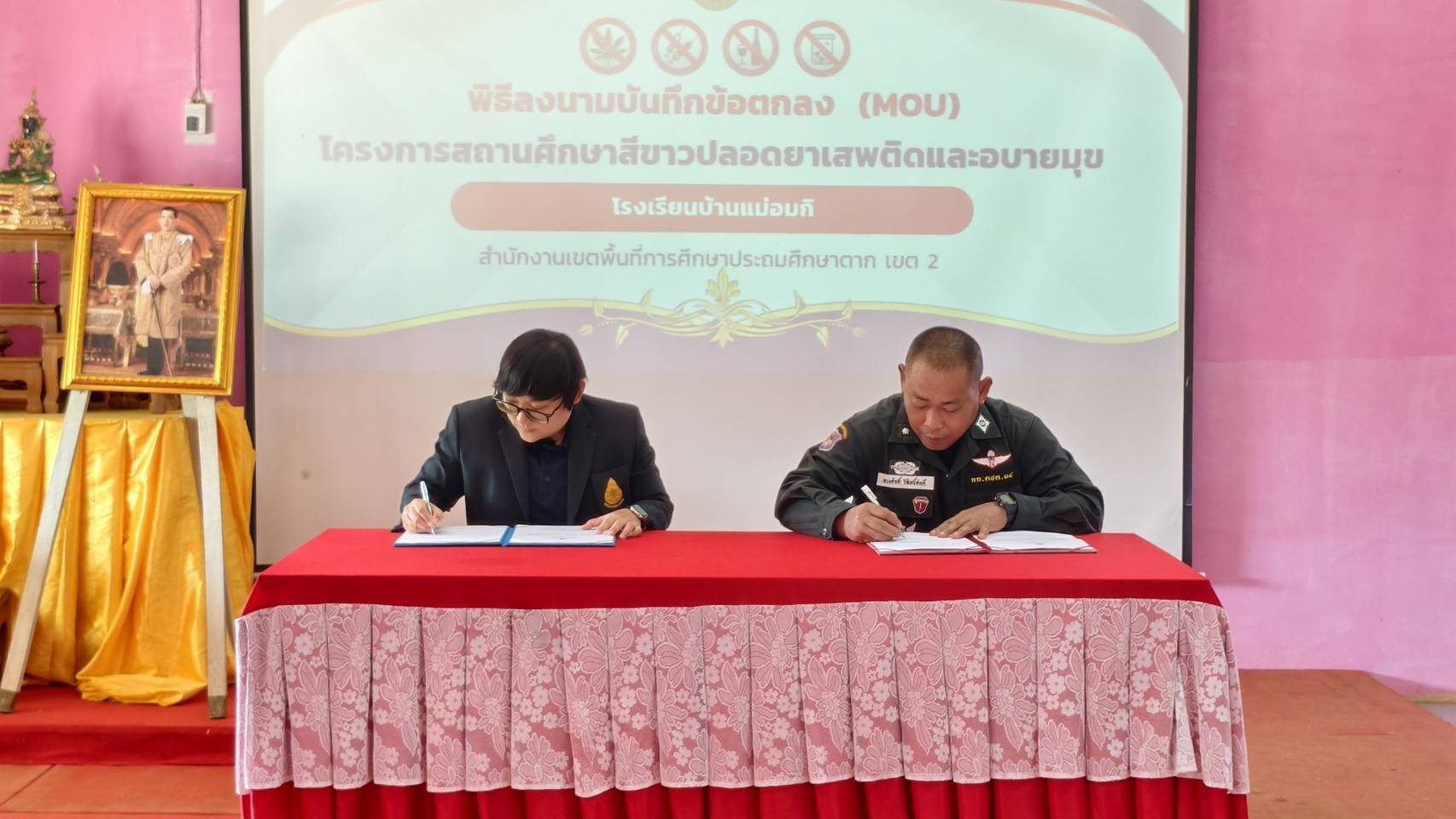ชฝต.บ้านแม่อ​มกิ​ จัด กพ. ๒ นาย ร่วมลงนามบันทึกข้อตกลงความร่วมมือ (MOU) เรื่อง การป้องกันและแก้ไขปัญหายาเสพติดในสถานศึกษา