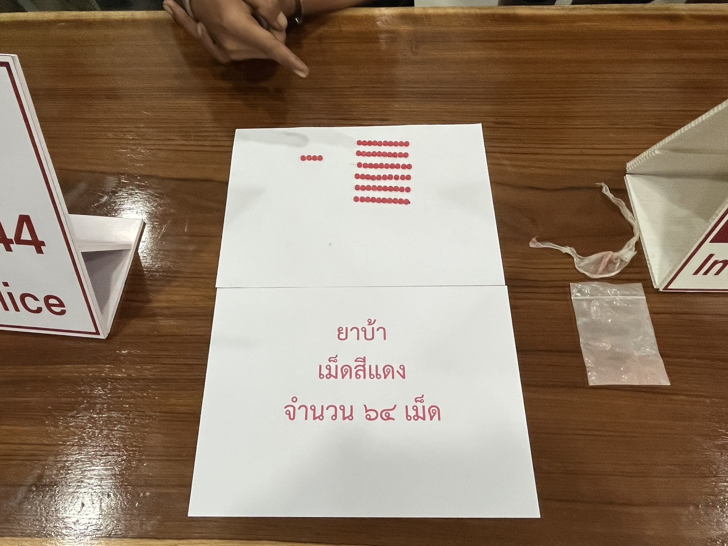 6.ของกลาง : ยาเสพติดให้โทษในประเภท 1 (ยาบ้า) จำนวน 64 เม็ด บรรจุในซองซิป เปิด-ปิด