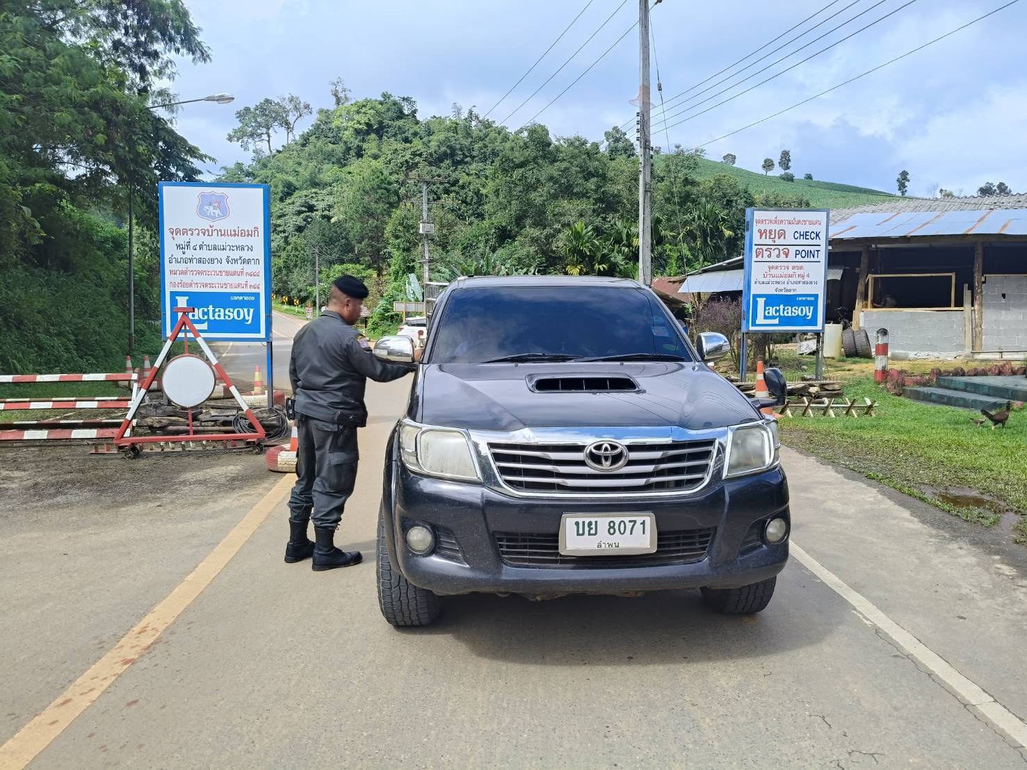 เมื่อ 090800 - 100759 ก.ย.68 ชฝต.บ้านแม่อมกิจัด กพ 3 นาย ทำการตั้งจุดตรวจ-จุดสกัด บนทางหลวงหมายเลข 105 (แม่สอด-แม่สะเรียง) บริเวณหน้าจุดตรวจบ้านแม่อมกิ ม.4 ต.แม่วะหลวง อ.ท่าสองยาง จ.ตาก เพื่อป้องกันปราบปรามอาชญากรรมสำคัญ การลักลอบลำเลียงยาเสพติด สารตั้งต้นและเคมีภัณฑ์,การปราบปรามคนร้ายข้ามชาติและเข้าเมืองโดยผิดกฎหมาย ประชาสัมพันธ์ให้ประชาชนได้รับทราบ