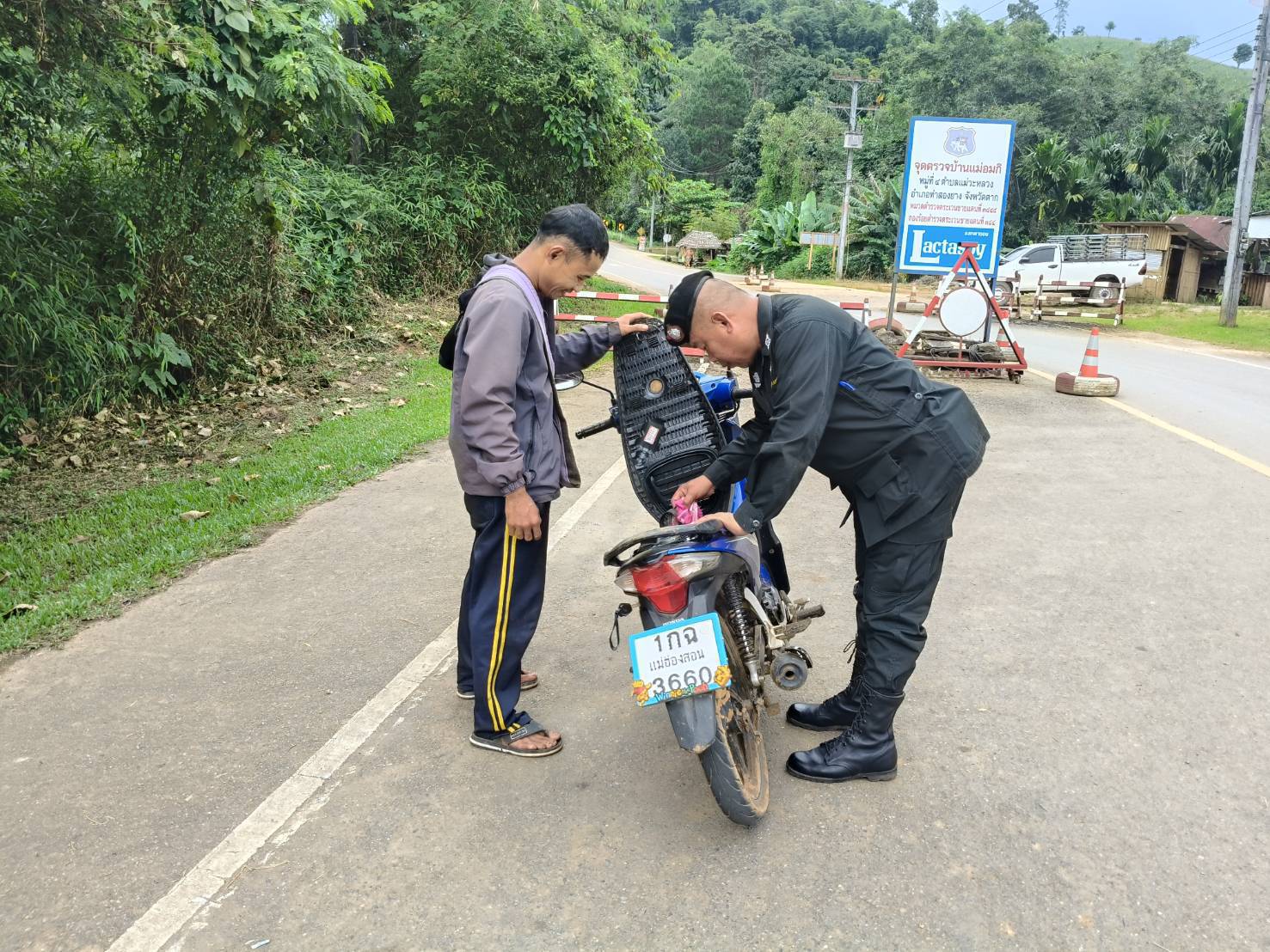 เมื่อ 060800 - 070759 ต.ค.68 ชฝต.บ้านแม่อมกิ​จัด กพ.3 นาย ทำการตั้งจุดตรวจ-จุดสกัด บนทางหลวงหมายเลข 105 (แม่สอด-แม่สะเรียง) บริเวณหน้าจุดตรวจบ้านแม่อมกิ ม.4 ต.แม่วะหลวง อ.ท่าสองยาง จ.ตาก เพื่อป้องกันปราบปรามอาชญากรรมสำคัญ การลักลอบลำเลียงยาเสพติด สารตั้งต้นและเคมีภัณฑ์,การปราบปรามคนร้ายข้ามชาติและเข้าเมืองโดยผิดกฎหมาย ป้องกันและควบคุมการลักลอบเคลื่อนย้ายสัตว์และซากสัตว์ ประชาสัมพันธ์ให้ประชาชนได้รับทราบ