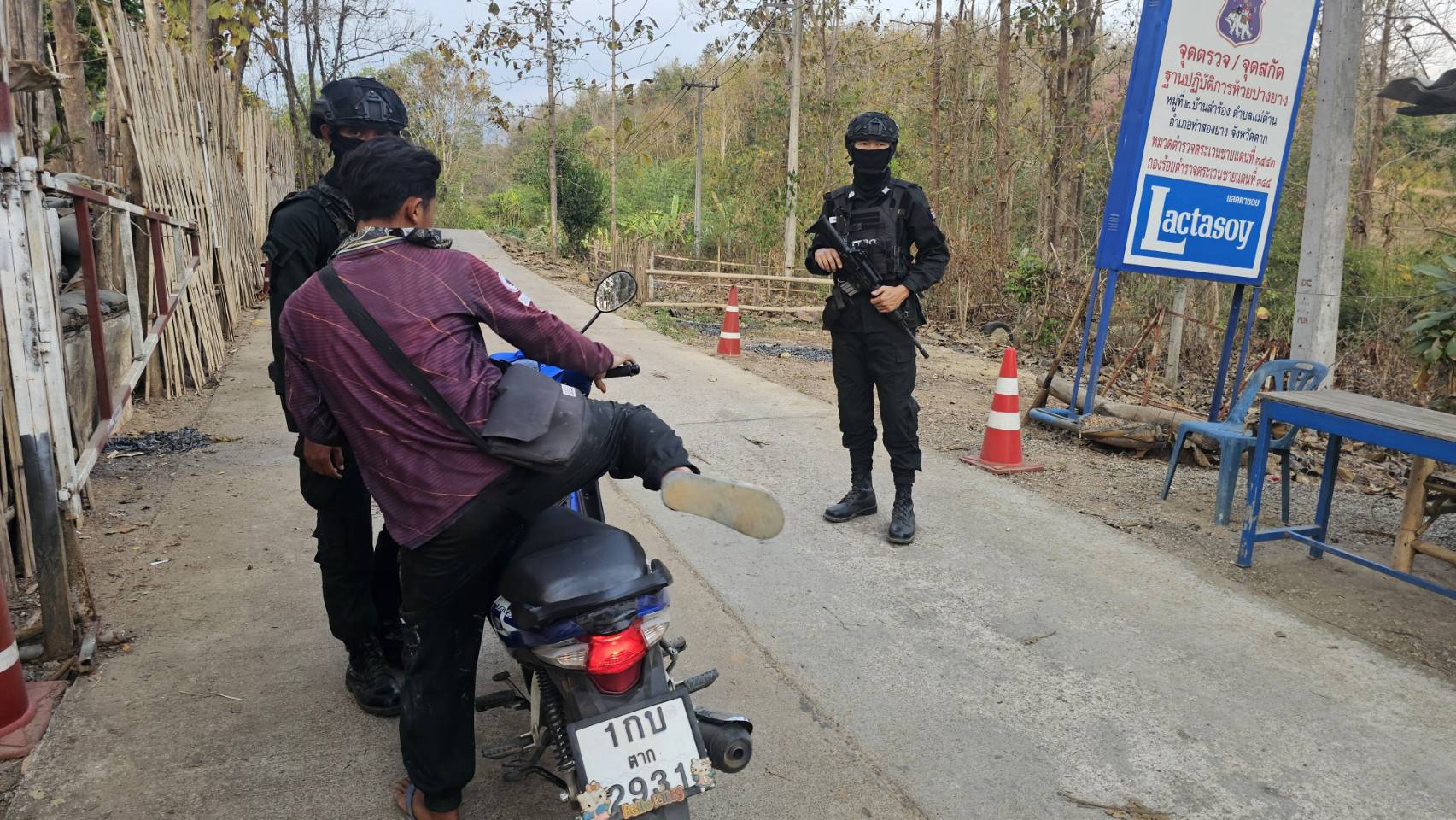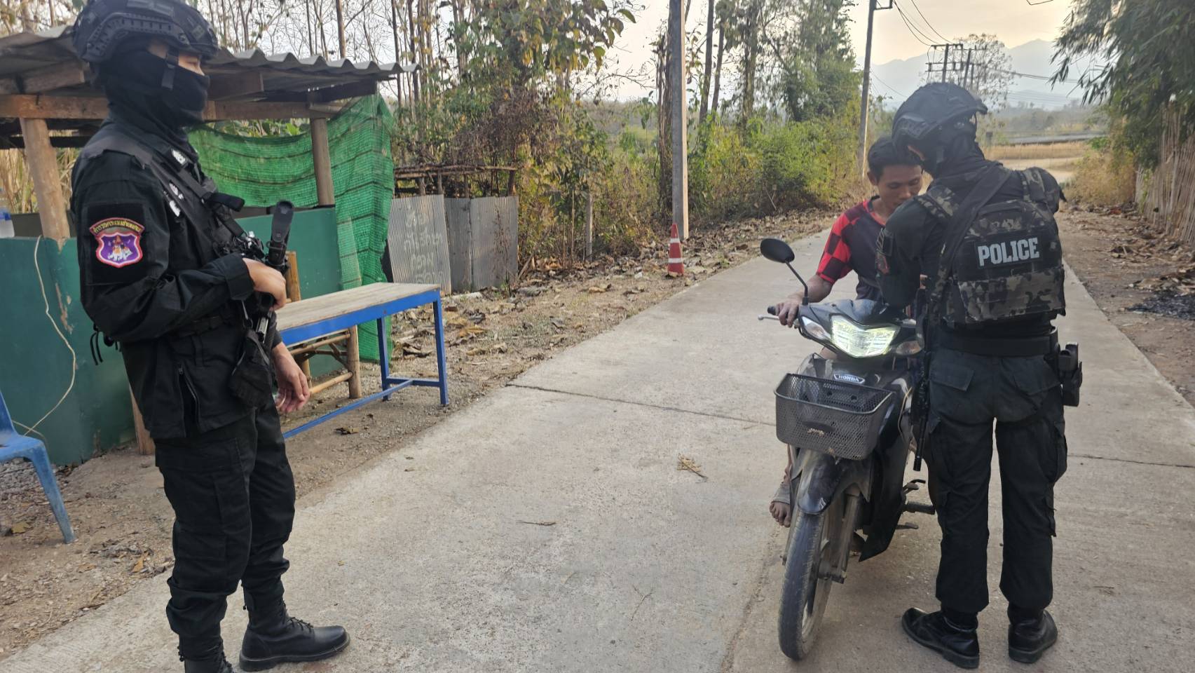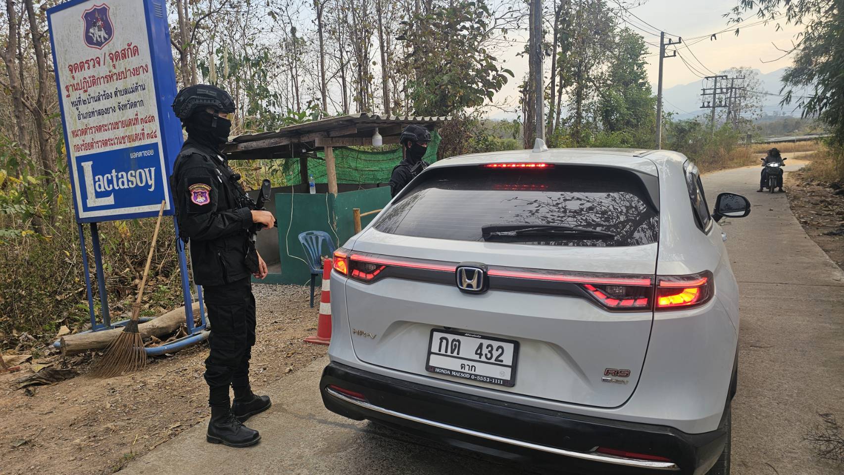 เมื่อ 241600 ก.พ. 69 มว.ตชด.3443 จัด กพ. 1 ชป. ตั้งจุดตรวจ/จุดสกัด บริเวณหน้าฐาน ปบ.ห้วยปางยาง ม.2 ต.แม่ต้าน อ.ท่าสองยาง จว.ตาก เพื่อ ตรวจสอบ /ป้องกัน /ป้องปราม การลักลอบนําเข้า - ส่งออก ของโค ,สุกร ,พืชผลทางการเกษตร ,แรงงานต่างด้าว ,เฝ้าระวังการรุกล้ำอธิปไตย ของ กกล. ต่างชาติ และการกระทำผิดตาม พรบ. ที่มีโทษทางอาญา ตรวจสอบเครือข่ายแก็งคอลเซ็นเตอร์ฯ เพื่อป้องกันการลักลอบเข้า/ออกราชอาณาจักรโดยผิดกฎหมาย การลักลอบขนน้ำมันเชื้อเพลิงออกนอกราชอาณาจักร ป้องกันการลักลอบลำเลียงยาเสพติด สารตั้งต้น และเคมีภัณฑ์