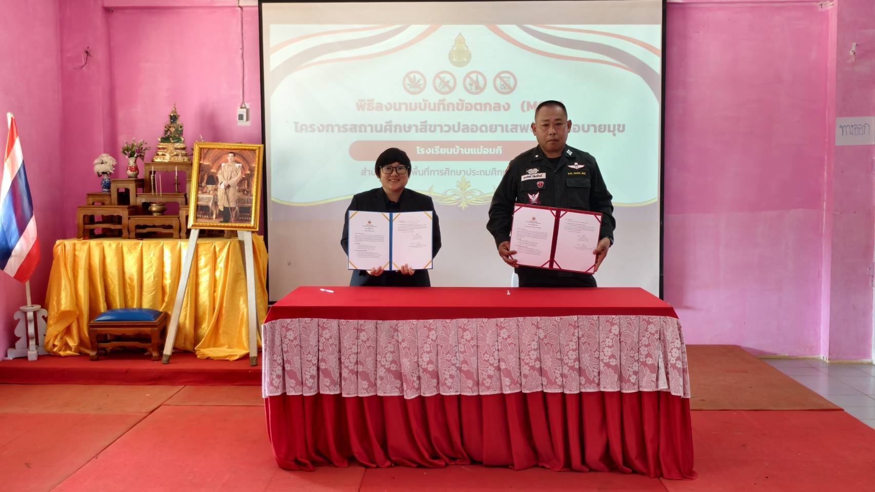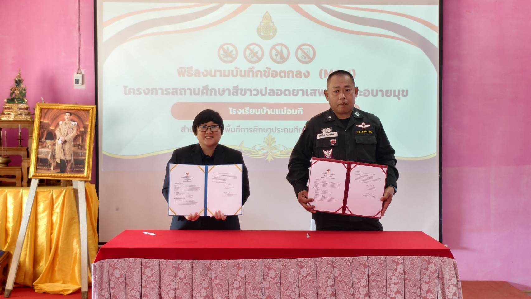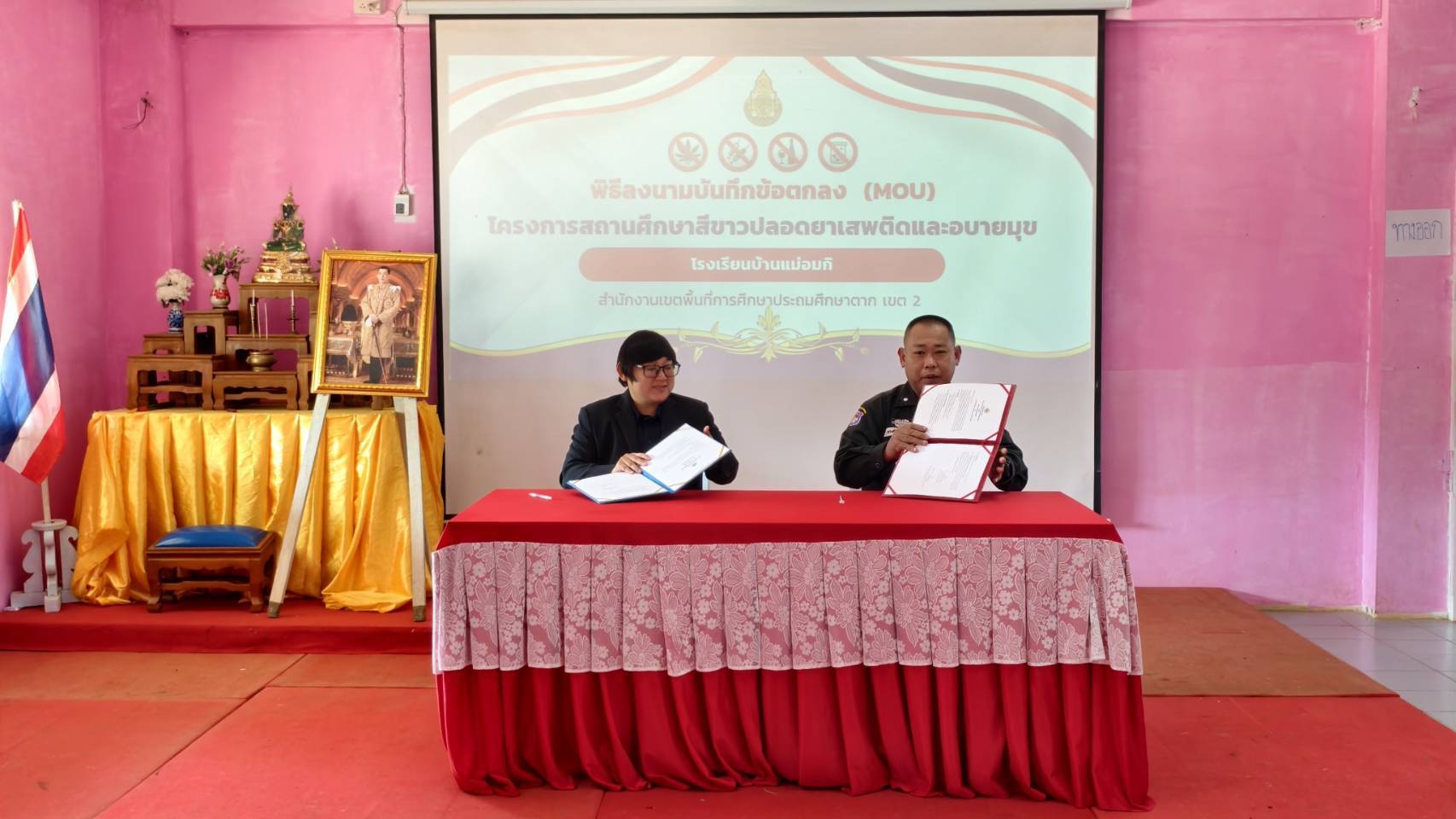 ชฝต.บ้านแม่อ​มกิ​ จัด กพ. ๒ นาย ร่วมลงนามบันทึกข้อตกลงความร่วมมือ (MOU) เรื่อง การป้องกันและแก้ไขปัญหายาเสพติดในสถานศึกษา