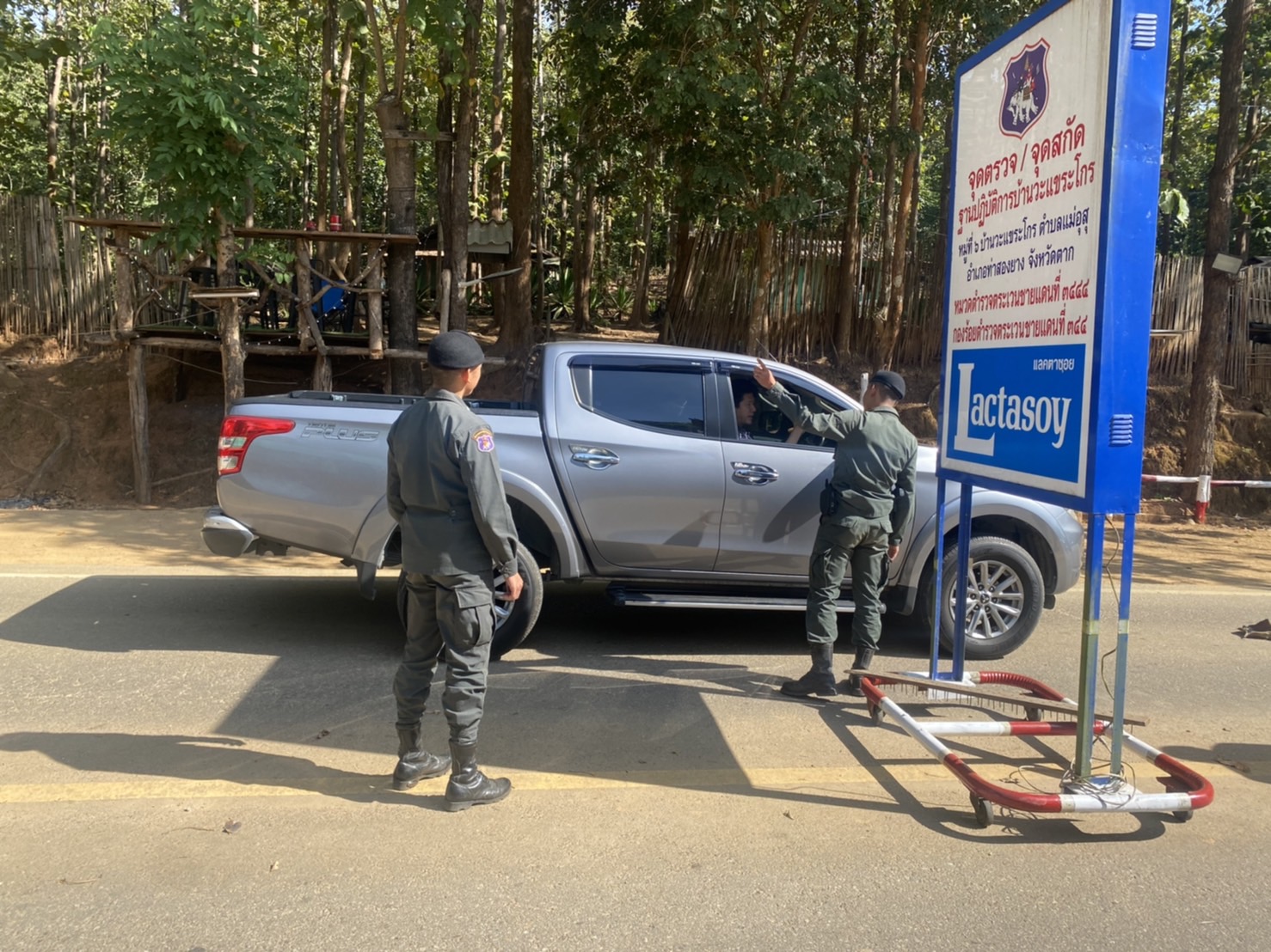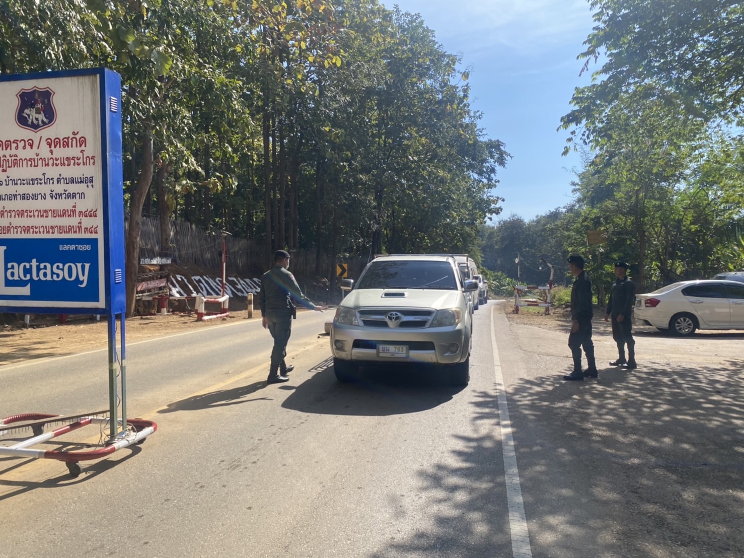 วะแขระโกร) รวม 4 นาย ตั้งจุดตรวจ/จุดสกัด เพื่อป้องปรามการกระทำผิดกฎหมายตาม พ.ร.บ.ที่มีโทษทางอาญา และสกัดกั้นการลักลอบเข้าเมืองโดยผิดกฎหมาย บริเวณหน้า ฐาน ปบ.การบ้านวะแขระโกร หมู่ 6 ต.แม่อุสุ อ.ท่าสองยาง จว.ตาก ผลการ ปบ.ไม่พบการกระทำผิดกฎหมายแต่อย่างใด